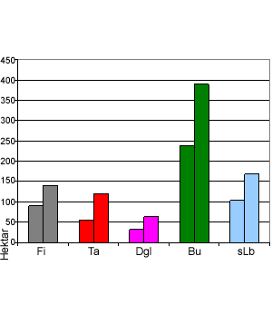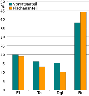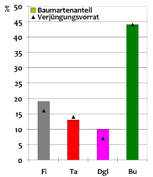 Abb. 7: Baumarten- und Verjüngungsflächen: die Dgl ist im Verjüngungsvorrat unterrepräsentiert (SW "Alt-Kandern", 2007).