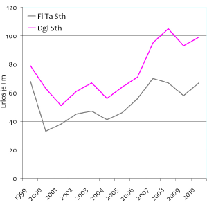 Abb. 3b: Entwicklung der Stammholzdurchschnittserlöse für Fi/Ta im Vergleich zu Dgl (SW Lörrach).
