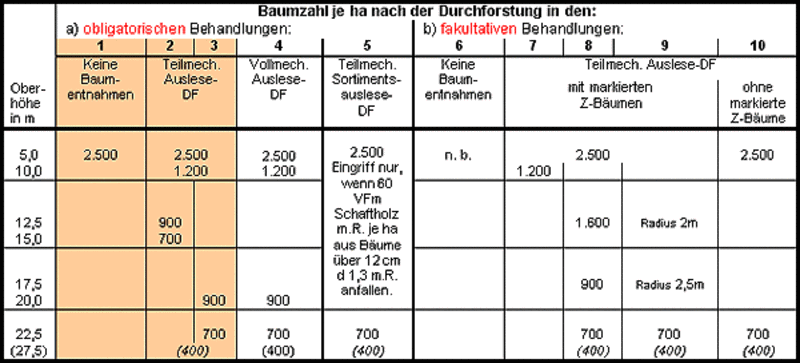 - die Auswahl und Freistellung der Z-Bäume bei einer Oberhöhe von 12 m-15 m einsetzen;
