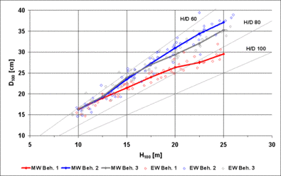 Obwohl die Durchforstungen im Vergleich zum Behandlungsprogramm tendenziell zu spät – im Extrem bis zu 3 Oberhöhenmeter nach dem programmgemäßen Eingriffszeitpunkt – erfolgt sind, bleibt eine ausreichend starke Differenzierung und Abgrenzung der Behandlungsvarianten für einen Vergleich erhalten.