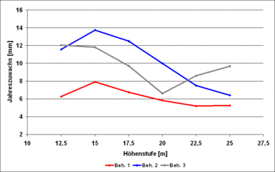 Die höchsten Durchmesserzuwächse erreicht die früh auf Endbaumzahl reduzierte Behandlung 2. Das Ausbleiben weiterer Durchforstungen nach Oberhöhe 15 m führt im weiteren Verlauf aber zu einer deutlichen Reduktion des Durchmesserzuwachses. Bei Oberhöhe 25 m liegt der Wert des durchschnittlichen jährlichen Durchmesserzuwachses mit wenig über 6 mm annähernd auf dem Niveau der undurchforsteten Behandlung 1.