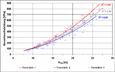 So haben die in Baden-Württemberg auf sehr guten Bonitäten (dGz100 >16 VFm/J/ha) angelegten Flächen der Behandlung 3 bei Oberhöhe 25 m bereits die Gesamtwuchsleistung der unbehandelten Felder erreicht. Der bei den Durchforstungen zur Verfügung gestellte Standraum kann hier offenbar schneller genutzt und effektiver in Wuchsleistung umgesetzt werden, als dies auf schwächeren Standorten der Fall ist.