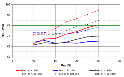 Für das Kollektiv der 201 bis 250 stärksten Fichten je ha – dem schwächsten Bereich der aktuell in der Waldentwicklungstypen-Richtlinie empfohlenen Z-Baumzahl - verlagern sich diese Werte aber um 15 Punkte nach oben. In der undurchforsteten Variante wird für dieses Kollektiv das Grenzmaß von 80 erheblich überschritten. Auch in Behandlung 3 treten bereits leichte Überschreitungen auf. Lediglich die anhaltend geführten, frühen Durchforstungen der Behandlung 2 gewährleisten selbst bei den schwächsten Z-Bäumen eine ausreichende Baumstabilität. Trotz der nach der letzten Durchforstung bei Oberhöhe 15,0 m langen Hiebsruhe, liegt ihr Wert aktuell unter dem der stabilsten Bäume der undurchforsteten Vergleichsvariante 1 (Abb. 7).
