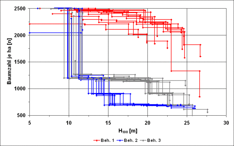 - Behandlung 3 – späte Reduktion auf Endbaumzahl: erster starker Eingriff bei Oberhöhe 10 m, zwei weitere, schwächere Durchforstungen nach langer Hiebsruhe bei Oberhöhe 20 m und 22,5 m.