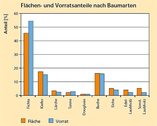 Die Fichte ist die häufigste Baumart im bayerischen Staatswald. Sie weist einen Flächenanteil von 46 Prozent und einen Vorratsanteil von 55 Prozent auf (Abb. 1). Etwa 170.000 ha (über 90 Prozent) der Fichtenfläche liegen außerhalb der natürlichen Verbreitung von Hochlagenfichtenwäldern.