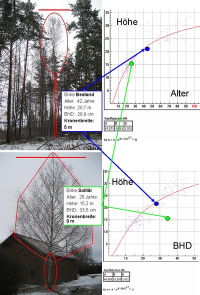 Die beiden Höhenkurven zeichnen den Höhenverlauf für 167 höhengemessenen Birken im Staatswald Tübingen. Die obere Grafik zeigt die Alters-Höhen Beziehung, die durch eine Regressionskurve ausgeglichen ist. Die untere Grafik hingegen die Beziehung der Höhe über den Brusthöhendurchmesser (BHD). Beide ausgewählten Beispiele, sowohl die Bestandesbirke, die schon in zwei Eingriffen gefördert wurde, wie auch die Solitärbirke, folgen der Höhenentwicklung. Allerdings hat die 17 Jahre jüngere Solitärbirke im BHD schon 4,5 cm Vorsprung. Vorausgesetzt beide Birken folgen weiterhin der Höhen- und BHD-Entwicklung, dann benötigt die Solitärbirke ein Alter von rund 50 Jahren, um einen BHD von 50 cm zu erzielen. Die Birke im Bestand wird 50 cm voraussichtlich erst mit rund 90 Jahren erzielen. Ein Alter, in dem sicher von einer Entwertung durch Kernbildung, bzw. Fäule ausgegangen werden kann [9].