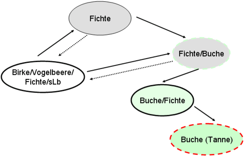 Die natürliche Sukzession (Abb. 1) eines Fichtenbestandes würde hier nach mehreren Generationen Fichte, Birke, Vogelbeere, etc. nach und nach mit Buche und Tanne in den geschlossenen Verjüngungszyklus laufen.