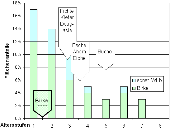 Während in der Altersstufe 1 dieser Betriebe der Flächenanteil der Birken noch bei 12 % und der sonstigen Weichlaubbäume bei 5 % liegt, nimmt der Birkenanteil bis zur 4. Altersstufe auf 4 % ab und hält sich auf diesem Niveau bis zur Altersstufe 7 (Abb. 4).