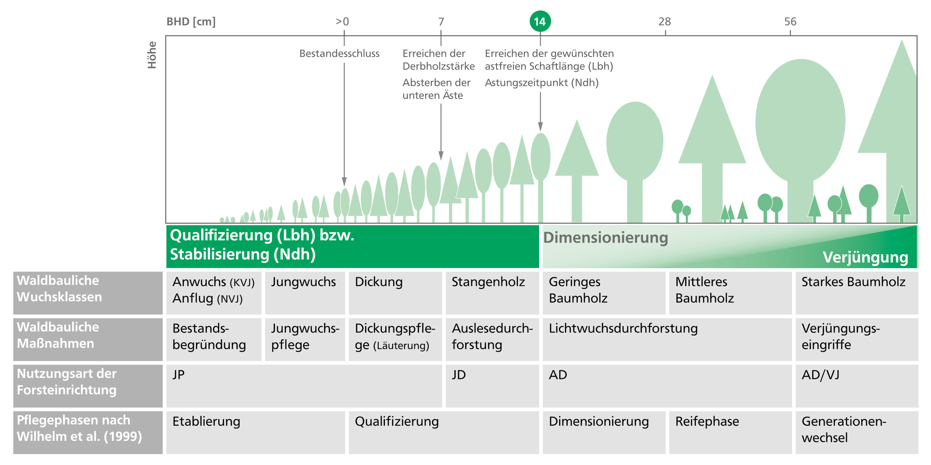- Erreichen der gewünschten astfreien Schaftlänge und/oder des BHD von ca. 14 cm bei den gewünschten Zielbäumen (12 cm bei Birke, Vogelkirsche, Aspe)