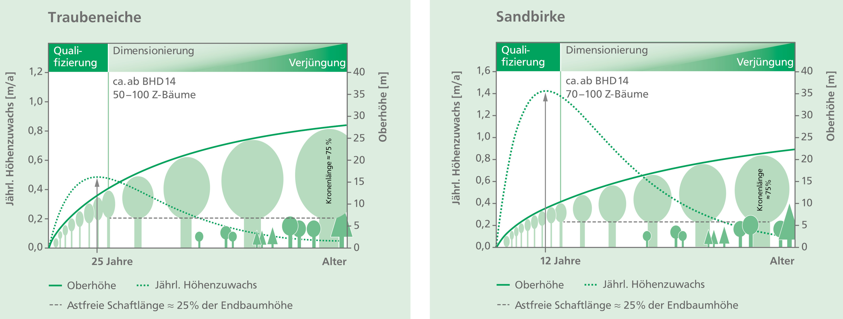 Die nachfolgen Grafiken zeigen das günstige Zeitfenster für den Kronenausbau um den Kulminationspunkt des Höhenzuwachses stellvertretend für zwei Baumartengruppen mit unterschiedlichen Überlebensstrategien (Klimaxbaumarten, hier: Traubeneiche / Pionierbaumarten, hier: Sandbirke). Sie geben zusätzlich durch den Vergleich des Zuwachsverhaltens der Baumarten Hinweise zur Zuwachsrelation zwischen konkurrierenden Baumarten und damit auf die Pflegenotwendigkeit und die Eingriffsstärke sowie die Wiederkehr notwendiger Eingriffe. Wie in den Grafiken symbolhaft dargestellt, soll zur Bildung einer vitalen, großen Krone ab dem Einstieg in die Dimensionierung bei etwa 14 cm BHD der untere Kronenansatz festgehalten werden. Erreicht wird dies durch die Rundum-Freistellung der Krone. Damit der Bestand nicht zu sehr aufgerissen wird, ist die Beschränkung auf Z-Bäume im weiten Abstand sowie das Belassen der Zwischenfelder ohne Behandlung entscheidend. Ein funktionsfähiger Unterstand hilft den Eingriff abzudämpfen und ist für die Beschattung der Schäfte wichtig.