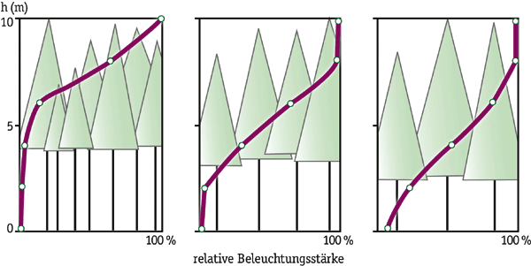 Erst in der Höhe des Kronenansatzes steigt die Beleuchtungsstärke deutlich an. Bedingt durch den Lichtmangel und die Konkurrenz ist die Baumkrone in dichten Beständen nur sehr kurz. In durchforsteten Fichtenbeständen nimmt hingegen die Beleuchtungsstärke mit der Bestandeshöhe, trotz der tief angesetzten Kronen, stetig zu. Ein Viertel der relativen Beleuchtungsstärke wird hier noch im untersten Kronendrittel erreicht (Abbildung 2).