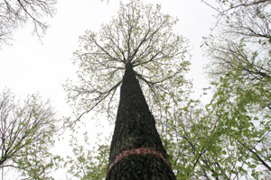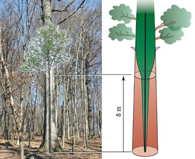 Noch ein Argument für den rechtzeitigen Durchforstungsbeginn: Es macht keinen Sinn, den Kronenschluss länger aufrecht zu halten, weil oberhalb der angegebenen Höhe kein Wertholz mehr produziert werden kann. Der Astreinigungsprozess geht wegen der länger werdenden Krone und den damit verbundenen dickeren Ästen immer langsamer vor sich. Deswegen vergrößert sich die Ausdehnung des inneren Astkernes stammaufwärts und die Ausbeute an astreinem Holz wird zu gering.