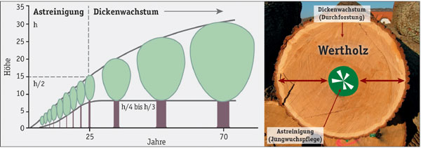 Abbildung 1: Links die richtige waldbauliche Behandlung eines Laubwertholzbaumes von der Etablierung bis zur Ernte und am rechten Bild die Wirkung auf den Holzaufbau des Blochs: kleiner Astkern – gleicher Durchmesser wie der Z-Baum zum Zeitpunkt der Erstdurchforstung, umgeben von einem breiten astreinen Gürtel.