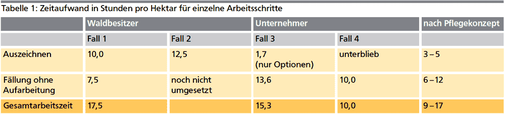 | Akzeptanz | Pflegeziel und Pflegeauftrag waren dem Waldbesitzer eingängig | Andere Pflegekonzepte waren nicht bekannt, dieses Verfahren erscheint in sich schlüssig | Prinzip, primär das Gute zu fördern, ist in Ordnung |