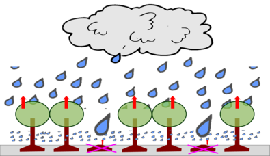Bei Regen wird ein Teil des Niederschlages im Kronendach zurückgehalten und verdunstet, ohne überhaupt erst auf den Boden zu gelangen (Abb. 2). Diese sogenannte Interzeption kann in Nadelbaumbeständen bis zu 30% des Niederschlags „verschwinden“ lassen, in Laubbaumbestände bis 20%. In von der Durchforstung im Kronendach geschaffenen Lücken entfällt die Interzeption und es kommt so etwas mehr Niederschlagswasser im Boden an.