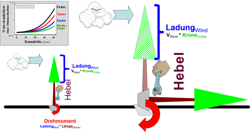Links: niedriger Baum – geringe Windladung (geringere Windgeschwindigkeit, kleinere Krone) bei kurzer Hebel (kurzer Stamm) führen nur zu geringer Belastung der Wurzel = geringes Risiko. Rechts: hoher Baum – große Windladung (höhere Windgeschwindigkeit, größere Krone) bei langem Hebel (langer Stamm) führen zu sehr hoher Belastung der Wurzel = sehr hohes Risiko.