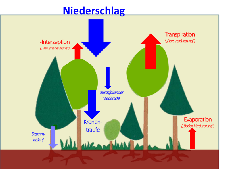 Das im Boden gespeicherte Wasser wird zum einen nach der Aufnahme über die Wurzeln von den Pflanzen aus Blättern/Nadeln verdunstet (Transpiration). Zum anderen kann Wasser auch direkt von der Bodenoberfläche aus verdunsten (Evaporation). Bei gleicher Einstrahlungsintensität übertrifft dabei die Verdunstung je Flächeneinheit Kronenoberfläche (Transpiration) die des nackten Bodens (Evaporation) in der Größenordnung um etwa das Zehnfache. Kommt es also nach Durchforstung dazu, dass die Sonnenstrahlung durch Lücken direkt bis auf den Boden reicht, steigt damit zwar die Evaporation vom Boden an, gleichzeitig sinken aber durch die verringerte Kronenoberfläche die Transpirationsverluste aus Blättern/Nadeln. Das heißt, die Gesamtverdunstung steigt damit nicht zwangsläufig an, sondern kann sogar – zumindest tendenziell – etwas zurückgehen.