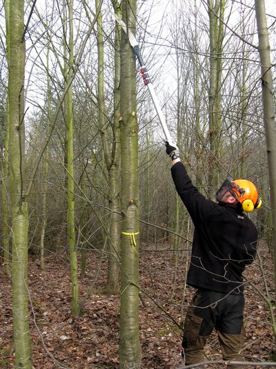 Astung: Die Astung ist bei der Kirsche obligatorisch. Für die im Forst übliche Trockenastung müssen die Äste am Erdstamm bis zum Alter von 15 bis 20 Jahren absterben. Um Pilzinfektionen bzw. Holzverfärbungen und –fäulen zu vermeiden, müssen die Astnarben möglichst rasch – in zwei bis drei Jahren – überwallt werden. Neben einem möglichst geringen Astdurchmesser ist hier eine Jahrringbreite von mindestens vier Millimetern in den Folgejahren ein entscheidender Faktor. Astung ist also nur bei vitalen Elitebäumen bis zum Alter von 20 bis maximal 25 Jahren sinnvoll. Die Grünastung wird in plantagenartigen, agroforstlichen Bewirtschaftungsformen angewandt und beginnt bereits im Alter von vier Jahren. Dabei werden unverkernte Äste mit weniger als drei Zentimetern Durchmesser im Juni glatt am Stamm abgeschnitten. Keinesfalls darf der Astkragen verletzt werden. Eine bereits vor der Dickungsphase beginnende Grünastung im ein- bis zweijährigen Rhythmus scheidet aus ökonomischen Gründen im Forst aus.