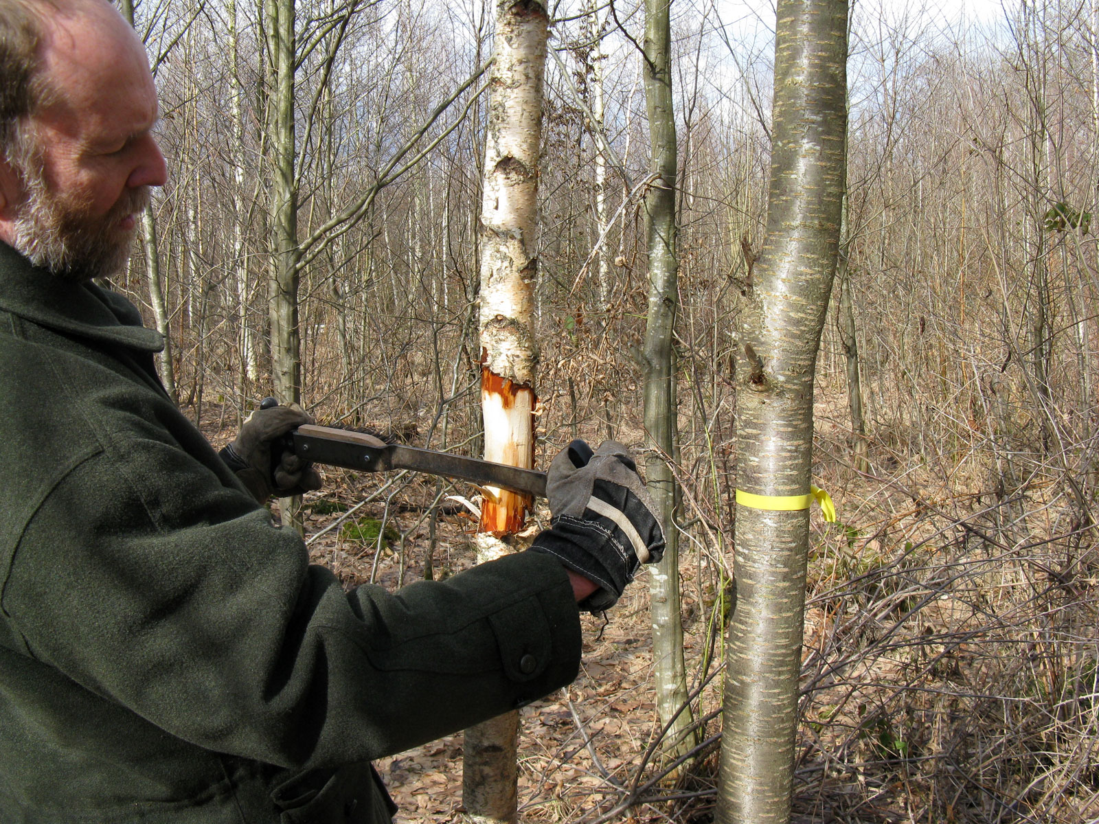 Qualifizierung: In der Jugend benötigen die Kirschen Dichtstand und Seitendruck. In der Jungbestandspflege finden in der Regel nur ein, maximal zwei schwache Pflegedurchgänge statt. Dabei werden nur Protzen, krebsige Bäume oder unerwünschte Mischbaumarten zurückgenommen. Es gilt der Grundsatz "Dickung bleibt Dickung", der maximal 200 Entnahmen je Hektar, am besten mittels Ringeln oder Köpfen, erlaubt. An den Eliteanwärtern dürfen keine stärkeren Steiläste oder Zwiesel entstehen. Bis zur Ausformung grünastfreier, gerader, ausreichend langer Schäfte sind die Kirschen im Dichtstand zu belassen. Als "qualifizierende Baumarten" eignen sich je nach StO Buche, Hainbuche, Linde oder Hasel. Eine Buchenumfütterung ist für den Seitendruck und die rechtzeitige Totastbildung oft besser als gleichwüchsige Nachbarkirschen. Entscheidend ist, dass die Kirschen ihren Wuchsvorsprung behalten.