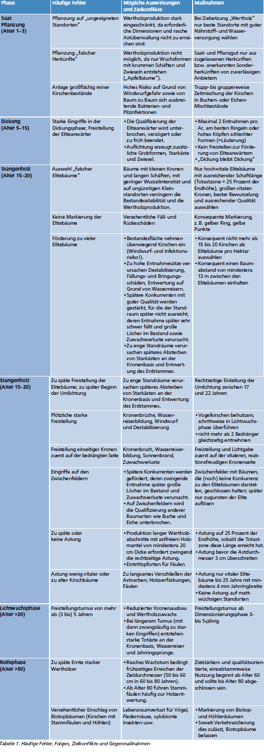 Reife- und Verjüngungsphase: Kirschen erreichen auf guten StO ihren Zieldurchmesser von 50 bis 60 Zentimetern in 60 bis 80 Jahren. Bereits ab dem Alter 60 kann daher eine zielstärken- und qualitätsorientierte, einzelstammweise Nutzung beginnen. Relativ früh einsetzende Kernfäulen können bereits ab dem Alter 80 Biotopbäume entstehen lassen, die Spechte gerne zur Anlage von Bruthöhlen nutzen.