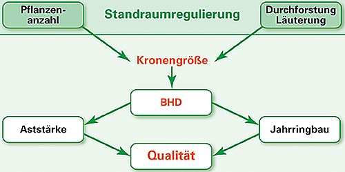 Das Weichenstellen beginnt bereits bei der Festlegung des Pflanzverbandes (Form, Pflanzenzahl). Jedem Baum wird dabei ab Bestandesschluss ein gewisser Raum zugedacht, der seine Kronengröße während des Höhenwachstums begrenzt. Denn: Die Kronengröße steuert das BHD-Wachstum und indirekt die maximal auftretenden Aststärken.