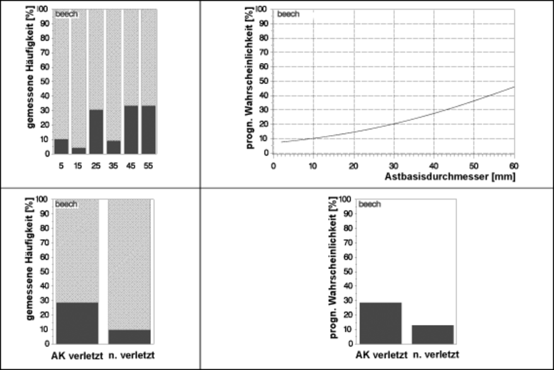 Abb. 2: Gemessene Häufigkeit (links) und prognostizierte Wahrscheinlichkeit (rechts) des Auftretens von Verfärbungen in Abhängigkeit vom Astbasisdurchmesser (oben) oder Astkragenverletzungen (unten).