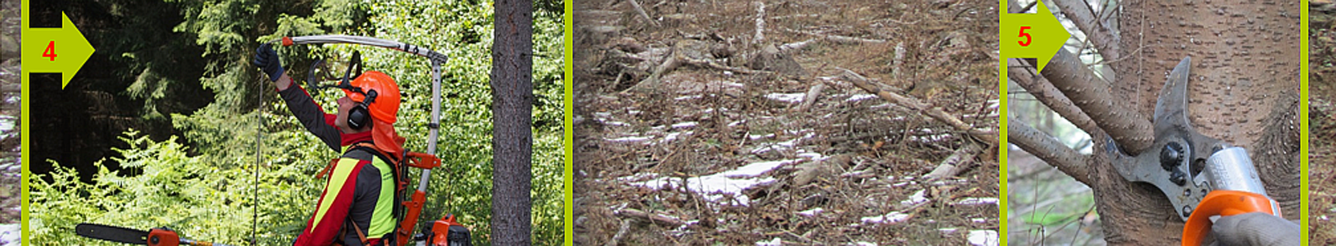 Abb. 2: Darstellung des Arbeitsverfahrens „Wertastung und erste Positivläuterung mit Akkuschere und Spacer“. Foto: Forstliches Bildungszentrum, T. Heimann