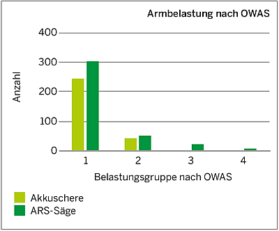 Verglichen wurden Akkuschere und ARS-Säge für die Astung sowie Spacer und leichte Motorsäge für die Bedrängerentnahme. In den Abbildungen 3 und 4 sieht man, dass die Arbeitsmittel Akkuschere und Spacer zu einer Reduktion belastender Körperhaltungen gegenüber ARS-Säge und Motorsäge führen.