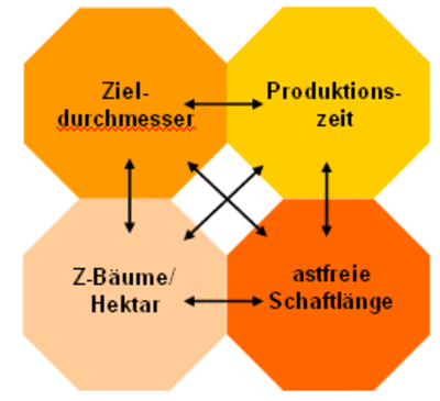 Die vier Elemente eines waldwachstumskundlichen Produktionsziels hängen voneinander ab (Abb. 1 ): Bei der Vorgabe eines Zieldurchmessers, den eine Baumart im Endbestand erreichen soll, kann die Anzahl der Bäume im Endbestand errechnet werden und zugleich auch die Produktionszeit innerhalb der ein gewünschter Zieldurchmesser erreicht wird.