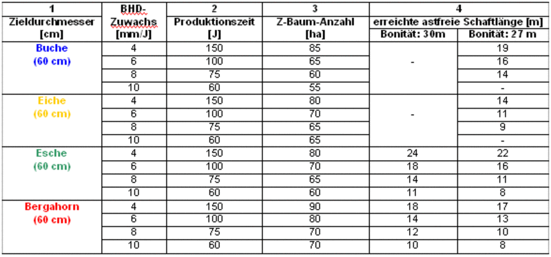 Zur einfachen, aber sinnvollen Zielbeschreibung bei der Wertholzproduktion gehören Angaben zu Zieldimension (Zieldurchmesser), zur Qualität (astfreie Schaftlänge) sowie Vorgaben zum zeitlichen und räumlichen Bezug (Produktionszeit und Anzahl der Z-Bäume). Aufgrund der baumarttypischen Wachstumsgesetzmäßigkeiten der vier genannten Laubbaumarten kann in relativ kurzer Produktionszeit stark dimensioniertes Wertholz erzeugt werden. Diese exemplarische Gegenüberstellung darf jedoch nicht darüber hinwegtäuschen, dass für jede Baumart eigene Randbedingungen gelten, die zusätzlich Berücksichtigung finden müssen: Dazu gerhören bei der Buche der Rotkern, bei der Esche der Braunkern und bei der Eiche die zum Teil gewünschten engen Jahrringe sowie ihre Gefährdung durch Wasserreiser bei plötzlicher Freistellung.