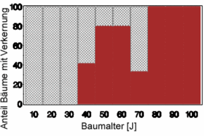 Verfärbungen, die bei der Birke in der Regel als Braunkern auftreten, spielen für die Wertholzproduktion eine entscheidende Rolle, da stärker ausgeprägter Braunkern hochwertige Holzverwendungen (Furnier-, Schnittholz) ausschließt. Tatsächlich trat bei den auf Verfärbungen untersuchten 70 Birken, etwa ab 40 Jahre, mit zunehmendem Alter und BHD vermehrt Braunkern auf (Abb. 3). Über 60jährige Birken waren nur noch mit wenigen Ausnahmen frei von Braunkern.