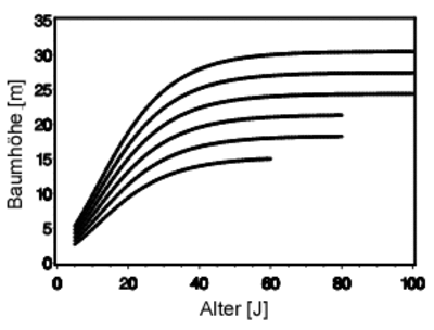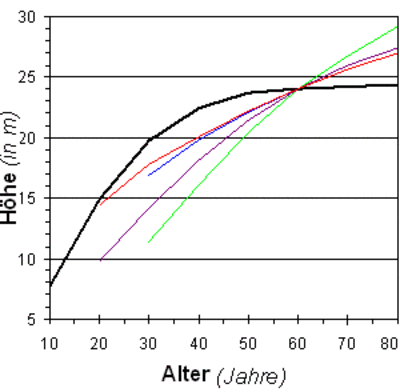 Abb. 1: Höhenentwicklung von Birken. Höhenbonitätsfächer abgeleitet von HEIN et al. [1] aus aktuellen Messungen in Süddeutschland (berechnet für im Alter 60 Jahre erreichte Höhe von 15 – 30 m in Höhenschritten von 3 m).