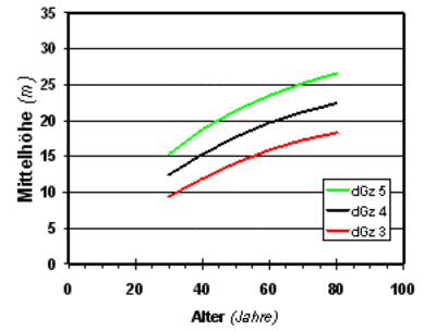 Aus den umfangreichen Messdaten ließ sich ein Bonitätsfächer ableiten (Abb. 1), der wesentliche Besonderheiten des Höhenwachstums deutlich macht. In der Jugend zeigt die Birke das für eine Pionierbaumart mit hohem Lichtbedarf erwartete außerordentlich rasche Höhenwachstum. Der Höhenzuwachs geht jedoch bald stark zurück und führt frühzeitig ab ca. 30 - 40 Jahren in die Endphase über mit nur noch marginalen Höhenzuwächsen. Daher erscheint es zweckmäßig, die Bonität bei Birke bereits mit der im Alter 60 Jahre erreichten Höhe zu charakterisieren.