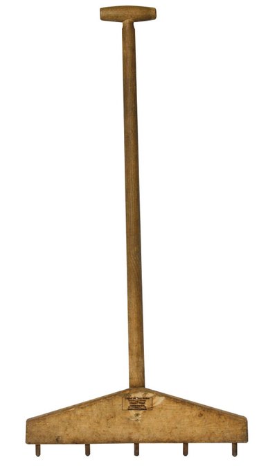 Der Brombeer-Rechen besteht aus einem geraden Spatenstiel mit Quergriff (95 cm lang, Eschenholz). Daran ist ein etwa 50 cm breites Querholz (Fichte) angeschraubt. In der Unterseite dieses Querholzes stecken fünf handelsübliche Zwölf-Millimeter-Holzdübel (Abb. 1). Mit dem Handgerät kann man schieben, stoßen und ziehen. Es wird entweder beidhändig geführt oder mit einer Hand als Stütz- und Gehhilfe verwendet.