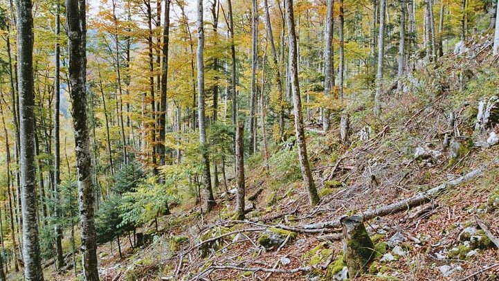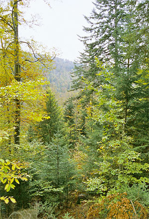 | Bestockung 50% Bu, 30% Fi, 15% Ta, BAh, Es, BUl, Struktur zweischichtig bis plenterartig | Geringere Dimensionen und Qualität, fast keine Verjüngung, teilweise labiler Bestand, Struktur einschichtig |