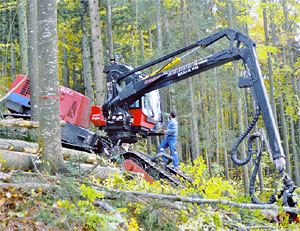 Sehr günstig wirkt sich die konsequente Anzeichnung der Auslesebäume mit farbigen Bändern aus, die es unbedingt zu schonen gilt. Ebenso positiv ist eine vertrauensbildende langjährige Zusammenarbeit zwischen dem Forstdienst und Unternehmern. Die Holzrückung aus dem Bestand erfolgt mit einem Forwarder, der durch einen speziellen Rückeschlepper bis zur Böschungsoberkante talwärts geseilt (gesichert) wird. Das Holz wird hangabwärts zu einem Maschinenweg transportiert und dort zwischengelagert. Ein zweiter Forwarder sortiert das Holz auf dem flachen Maschinenweg und führt es an die lastwagenbefahrbare Waldstrasse.
