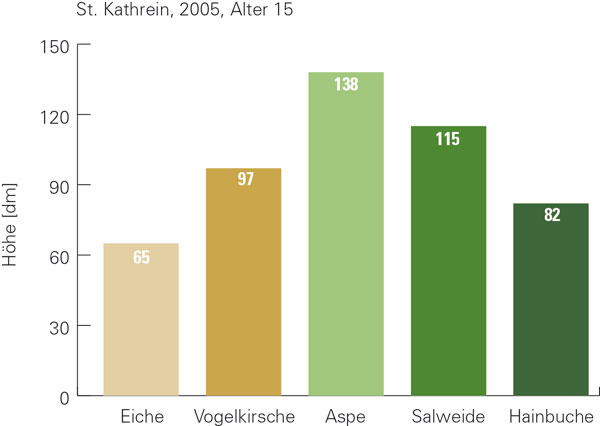 Abbildung 1: Unterschiedliche Oberhöhenentwicklung der Baumarten auf Mischwuchs-Versuchsfläche St. Kathrein. Eiche und Kirsche wurden in Trupps gepflanzt, Aspe, Salweide und Hainbuche aus Naturverjüngung.