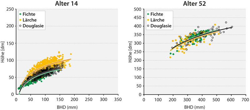 Probleme bei der Erziehung von Mischbeständen ergeben sich vor allem durch die unterschiedliche Höhenwuchsdynamik (Abbildung 1), spezifische Lichtansprüche, unterschiedliche Lebensdauer und Baumhöhe und unterschiedliches Reaktionsvermögen der Baumkronen der zu mischenden Baumarten. Dadurch scheiden konkurrenzbedingt in vielen Mischbeständen Baumarten bereits in relativ jungen Altersphasen wieder aus.