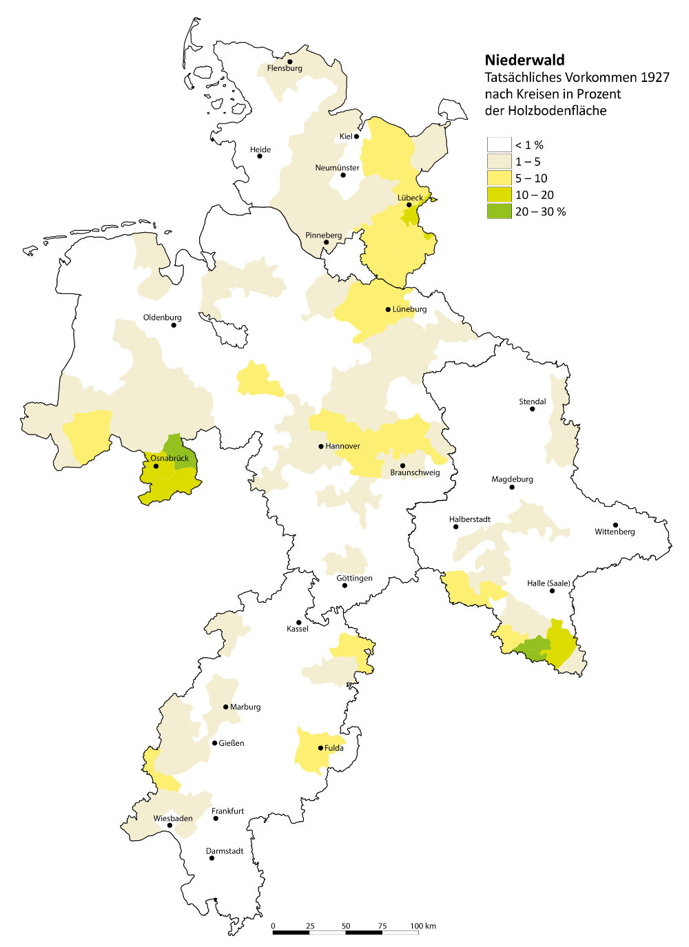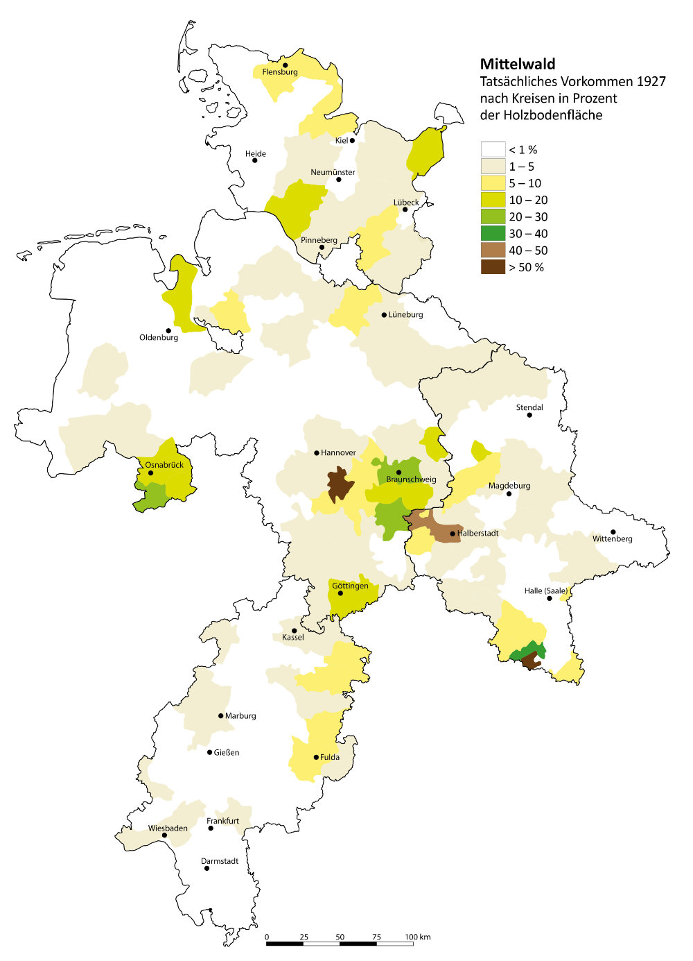 Die Tabelle gibt einen Überblick über die Fläche von Wäldern mit Nieder- und Mittelwaldstrukturen in Hessen, Niedersachsen, Schleswig-Holstein und Sachsen-Anhalt. Die räumlichen Schwerpunkte dieser Betriebsarten entsprechen dabei deren Vorkommen in den 1920er-Jahren, als sie insgesamt noch größere Flächen einnahmen. Allerdings fand auch in Nordwestdeutschland insbesondere in der zweiten Hälfte des 19. Jahrhunderts ein großflächiger Umbau von Nieder- und Mittelwäldern zu Hochwald statt. Im 19. Jahrhundert wie auch heute ist eine Bindung dieser Betriebsarten an die Art des Waldeigentums auffällig. So kommen Nieder- und Mittelwälder sowie deren Relikte vielerorts vor allem in Genossenschafts-, Gemeinde- und kleineren Privatwäldern vor. Von besonderer naturschutzfachlicher und soziokultureller Bedeutung sind bis heute genossenschaftlich genutzte Niederwälder im hessischen Lahn-Dill-Bergland, die insgesamt etwa 2000 ha umfassenden Hauberge mit Eiche und Birke. Im Kleinprivatwald des Weserberglandes und in Ostholstein wurde die Niederwaldwirtschaft zu einer mehr plenterartigen, einzelstammweisen Stockausschlagnutzung zur permanenten Brennholzerzeugung auf kleinen Besitzparzellen abgewandelt, die mitunter Mittelwaldcharakter aufweist.