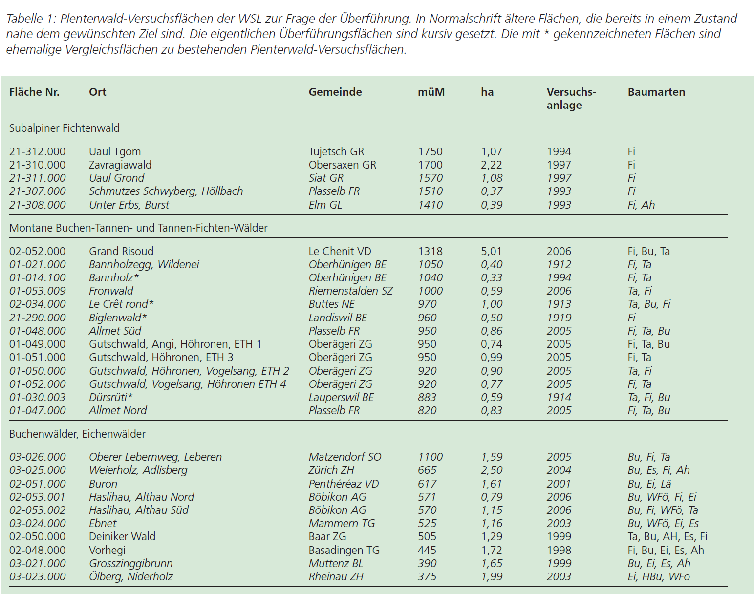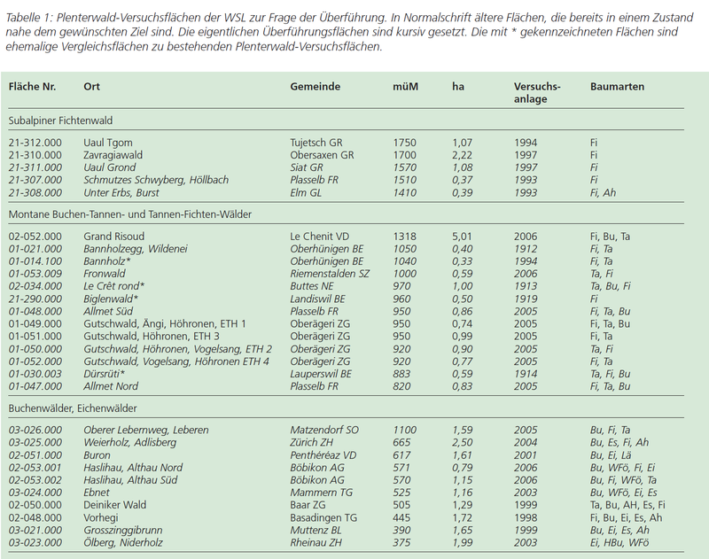 Die Plenterwald-Versuchsflächen der WSL (Tabelle 1) liegen zwischen 300 und 1800 m ü.M. Die Versuchsziele reichen von der Überführung gleichförmiger Bestände in Plenterwälder über die Plenterung in subalpinen Fichtenreinbeständen und in laubholzreichen Beständen bis zu Eichenwäldern. Anhand dieser Versuchsflächen und der Daten zu ihrem Zustand und ihrer Entwicklung lassen sich Fragen diskutieren, die sich im Zusammenhang mit der Plenterung von Wäldern ausserhalb des Tannen-Buchen-Waldes und der Plenterdurchforstung zur Überführung in Plenterwald stellen.