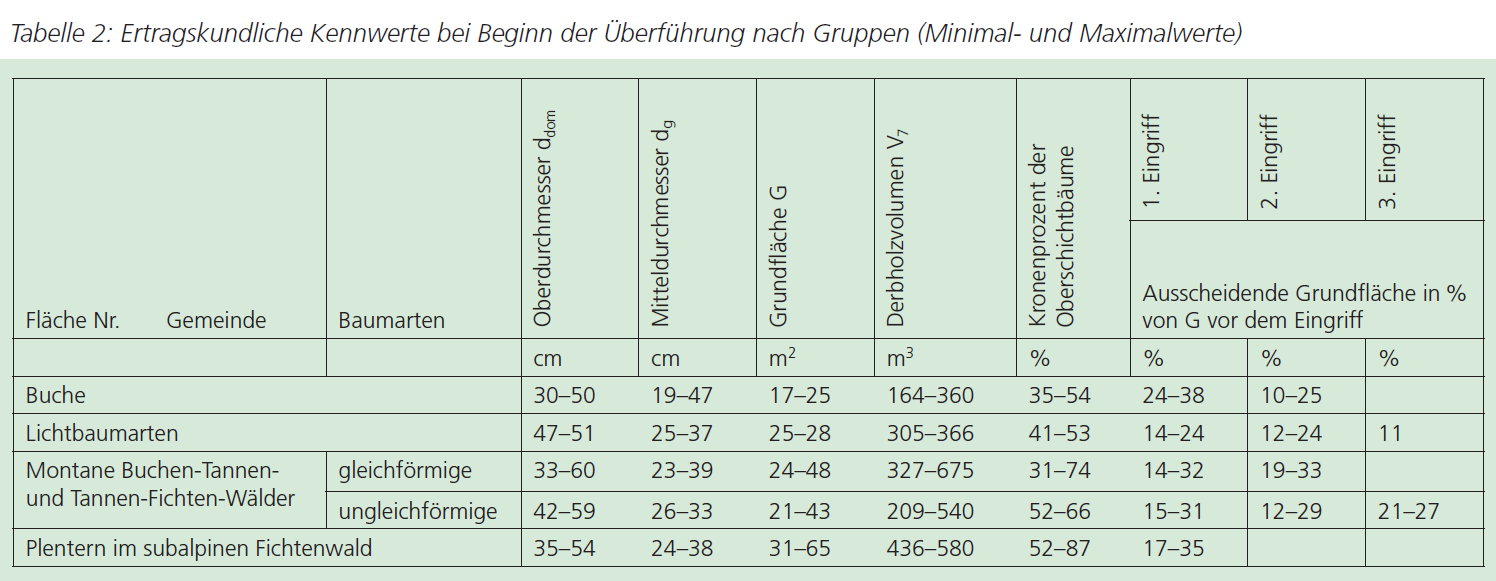 Welcher Bestand sich für die Überführung in einen Plenterwald eignet, ist nicht einfach zu entscheiden. Bestimmte Bestandesmerkmale wie die Stabilität oder die Durchmesserverteilung helfen bei der Entscheidung. Die Stabilität lässt sich nur beschränkt nach objektiven Kriterien beurteilen. Einigermassen mess- bzw. schätzbare Merkmale sind der Schlankheitsgrad des Hauptbestandes bzw. der Gerüstbäume und das Kronenprozent (siehe Tabelle 2).