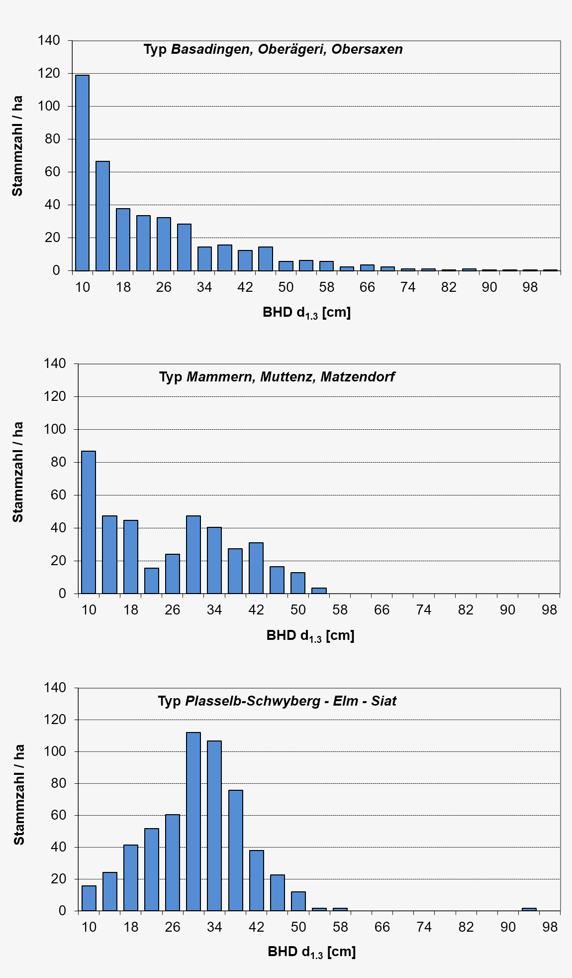 Es gibt drei Typen von Durchmesserverteilungen, die unterschiedliche Ausgangssituationen darstellen (siehe Abb. 3). Am nächsten an einer nachhaltigen Struktur und am einfachsten für die Überführung ist eine rechtsschiefe Verteilung der Durchmesser (oben). Hier sind zahlreiche kleinere Bäume vorhanden, die das Licht für die Verjüngung steuern und gleichzeitig zur zukünftigen Mittelschicht gehören können. Auch eine zweigipflige Verteilung (Mitte) ist noch eine gute Ausgangslage, eine flächige Unterschicht muss möglicherweise differenziert behandelt werden. Die "Normalverteilung" (unten) ist typisch für gleichförmige Bestände. Hier dürfte es am schwierigsten sein und am längsten dauern, bis man eine nachhaltige Struktur mit Verjüngung erreicht.
