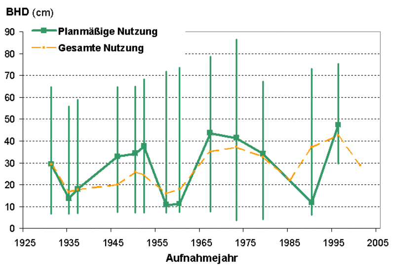 Der mittlere BHD aller ausgeschiedenen Bäume ist im Durchschnitt aller Versuche unter 30 cm. Dabei liegen zufällige Nutzungen durch Sturm mit 39 cm im stärkeren Bereich und noch 3 cm über dem BHD des planmäßigen Einschlags.