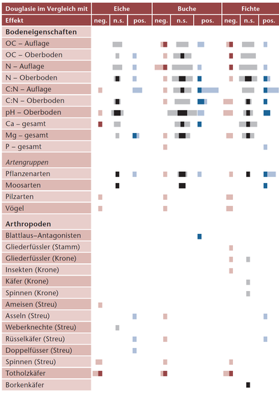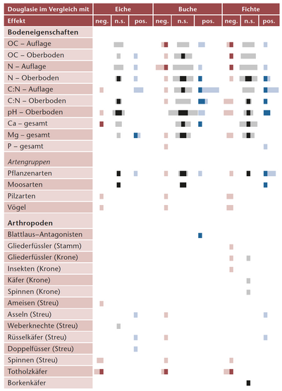 Abb. 4 - Effekte (negativ, nicht signifikant, positiv) auf Boden und Biodiversität in Vergleichsstudien von Douglasienreinbeständen mit reinen oder gemischten Beständen aus Eiche, Buche und Fichte in Mitteleuropa (Referenzen siehe Originalartikel). Dunkle Farbtöne beziehen sich auf belastbare Studien mit mehreren Vergleichspaaren, helle auf Fallbeispiele, in denen nur Pflanzungen an einem Standort miteinander verglichen wurden. Ein Quadrat stellt eine Studie dar; bei nicht signifikanten Eigenschaften kann eine Studie aus Symmetriegründen als zwei Halbquadrate links und rechts des Balkens zu liegen kommen.
