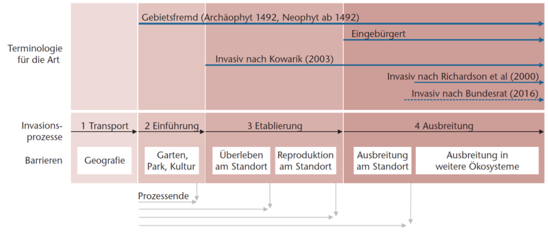 Abb. 3 - Prozesse der biologischen Invasion und damit verbundene Begriffe, verändert nach Blackburn et al. (2011) und mit Angaben von Kowarik (2003) und Schweizerischem Bundesrat (2016). Literaturverweise siehe Originalartikel.