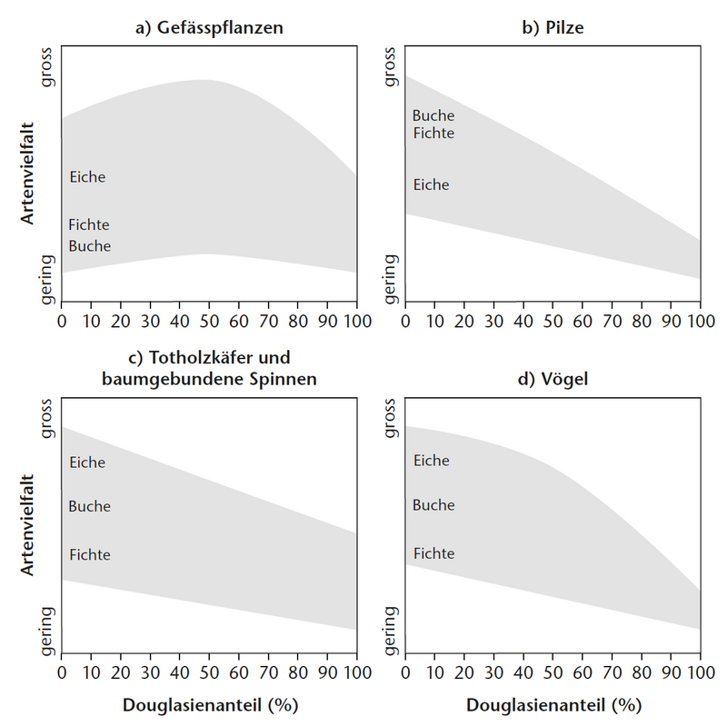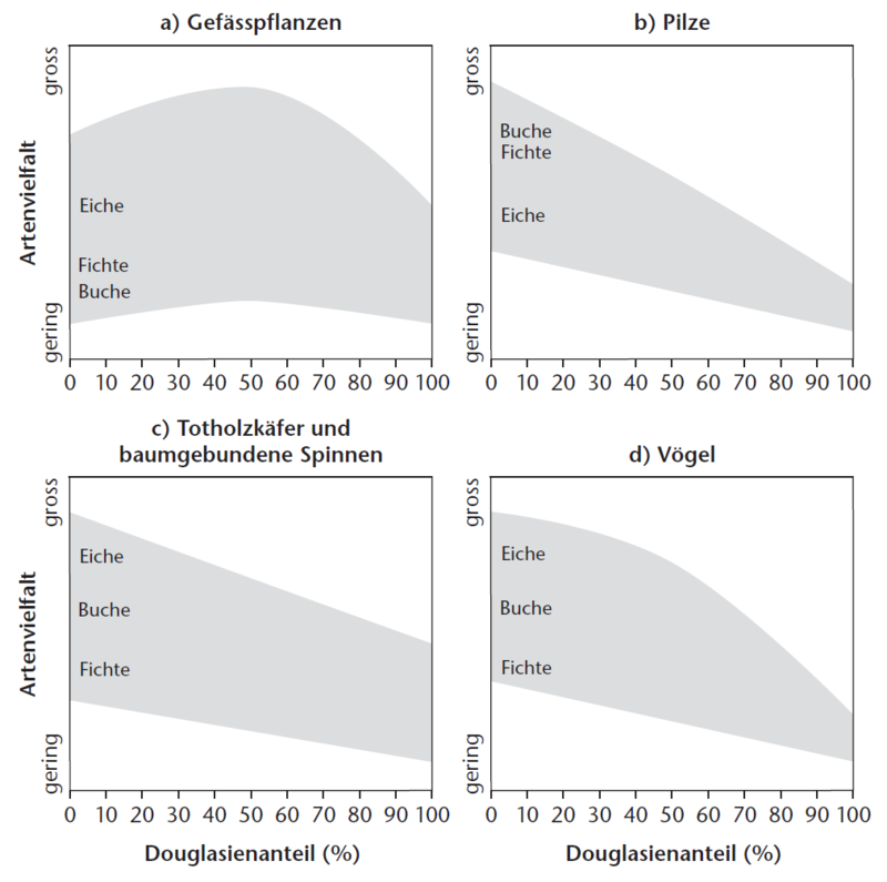 Die Biodiversität wird durch den Anbau der Douglasie, insbesondere bei sehr hohen Anteilen (Abb. 5) oder in Reinbeständen, gemäss den meisten Studien stark negativ beeinflusst. Dies zeigt sich in geringerer Anzahl Pilzen im Boden unter Douglasien, weniger Arthropodenindividuen und -arten in Baumrinden und Kronen der Douglasien, wodurch diese weniger Nahrung vor allem für überwinternde Waldvögel bietet. Zudem zeigt die Douglasie eine geringere Diversität an am Totholzabbau beteiligter Organismen.
