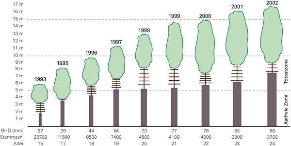 Abbildung 1: Eschenversuchsfläche Merkenstein – Entwicklung der Stammzahl und des astfreien Schaftes in einer Eschen-Naturverjüngung in Abhängigkeit des Alters während der Qualifizierungsphase. Bild: H. Schönauer, BFW