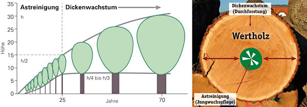 Abbildung 2: Zwei-Phasenkonzept zur optimalen Wertholzerzeugung. Bild: H. Schönauer, BFW