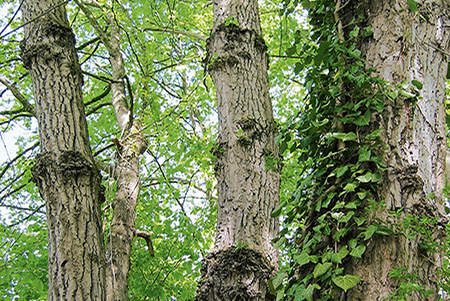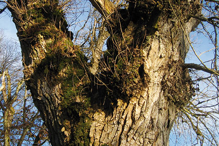 Abb. 2: Ausgeprägte Maserknollen und Bruthöhle am Stamm einer Schwarzpappel im Kreis Unna. Durchgetriebene Starkäste nach Rückschnitt verändern das ursprüngliche Kronenbild. Foto: L. Schulze