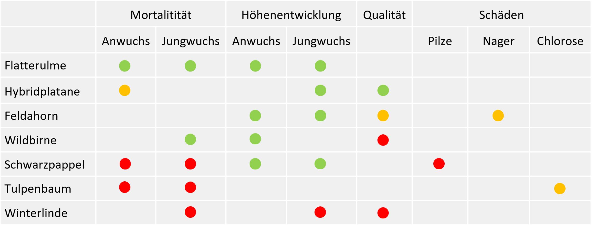 Beim Vergleich der Versuchsbaumarten fällt auf, dass es kaum eine Alternative gibt, die durchgehend gleich gut oder besser abschneidet als die Referenzbaumart Stieleiche (vgl. Abbildung 6). Lediglich die Flatterulme schneidet aktuell hinsichtlich der Ausfälle beim Anwuchs und beim Jungwuchs sowie der Höhenentwicklung besser ab – wurde aber auch nur an einem Versuchsort angebaut. Ein Vergleich mit den anderen Versuchsorten ist also nicht möglich und der Befall mit dem Ulmensterben in Zukunft nicht ausgeschlossen. Hybrid-Platane, Feldahorn und Wildbirne schneiden ebenfalls gut ab. Gerade die Platane zeigt sich vorwüchsig mit vorangeschrittenem Dichtschluss und einsetzender Astreinigung. Allerdings droht der Ausfall durch den Platanenkrebs (Ceratocystis fimbriata platani), wenn sich dieser nördlich der Alpen weiter ausbreitet. Bei Wildbirne und Feldahorn kommen häufiger Zwiesel oder Verbuschung vor, bei Feldahorn stellenweise auch Mäusefraß.